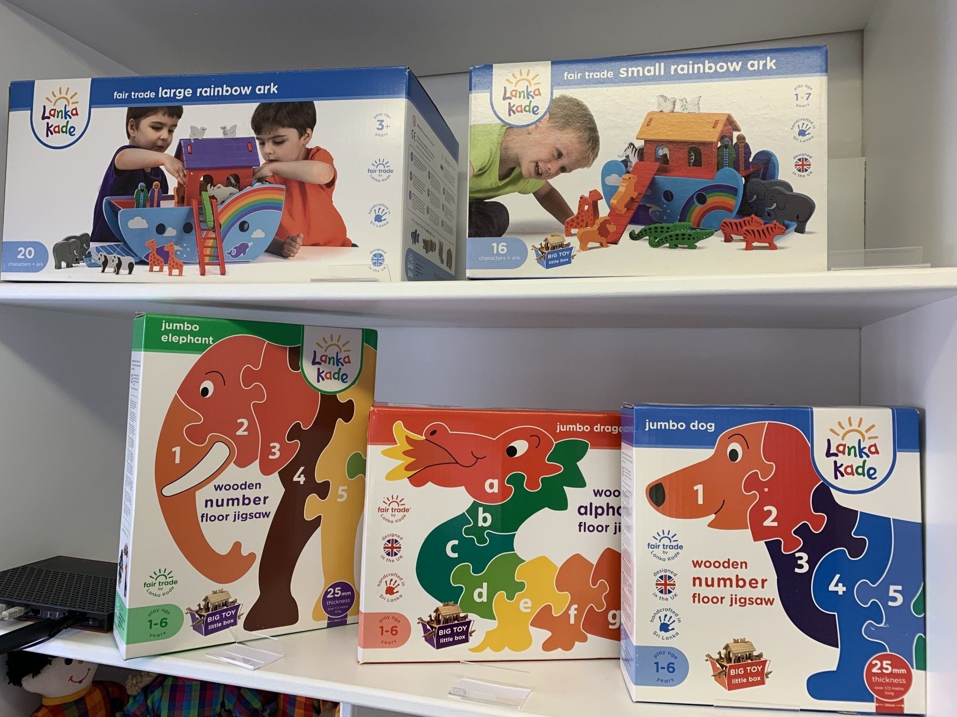 We stock wooden toys - handmade, fair trade from recycled materials including rubber wood. Toys are suitable from 3 months to 14 years. Touch rings, rattles, pram clips, mini trapeze, activity boards, humming tops, hobby horses, push along and pull along toys, dolls, rattles, skipping ropes, puzzles, activity toys