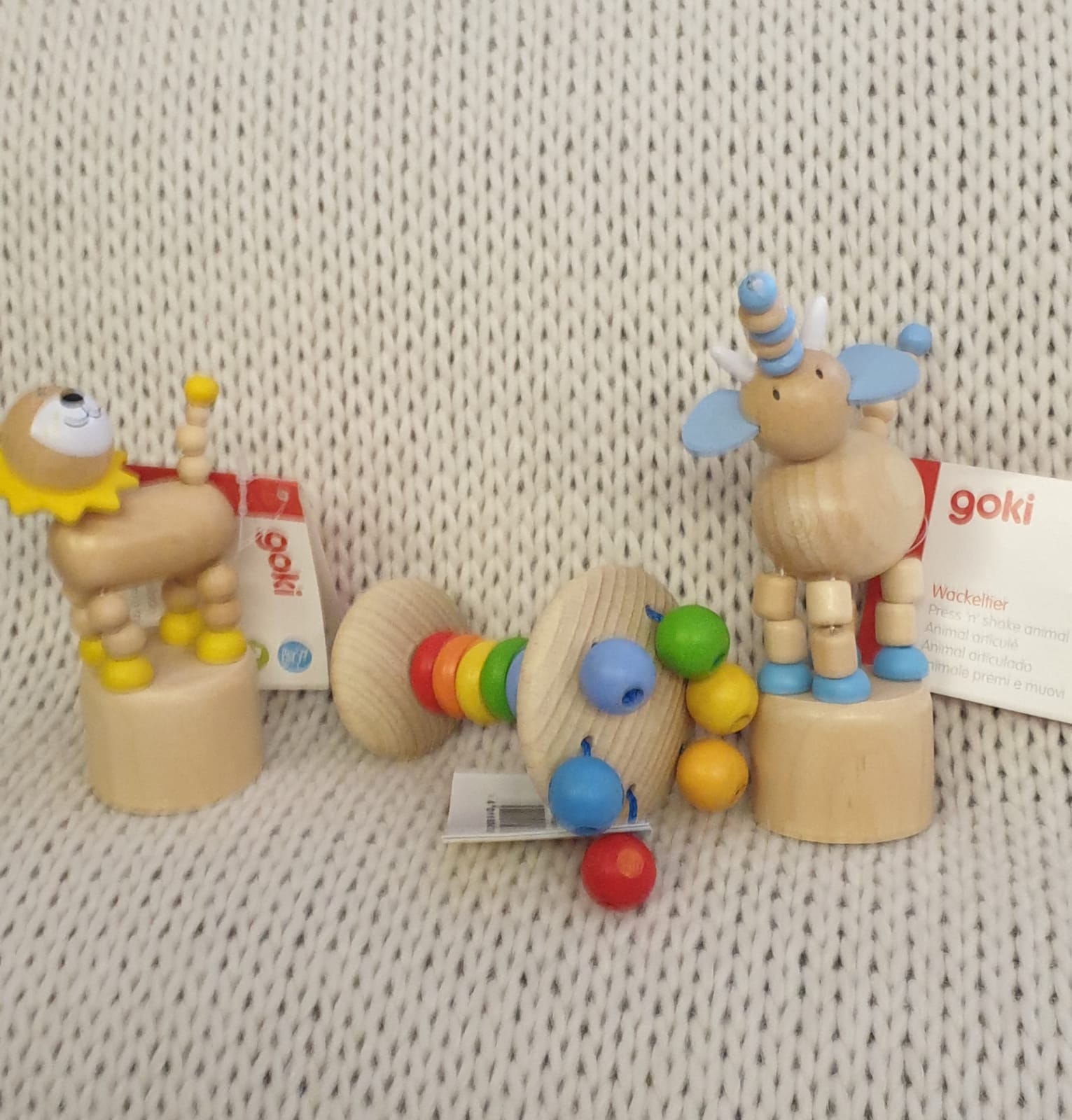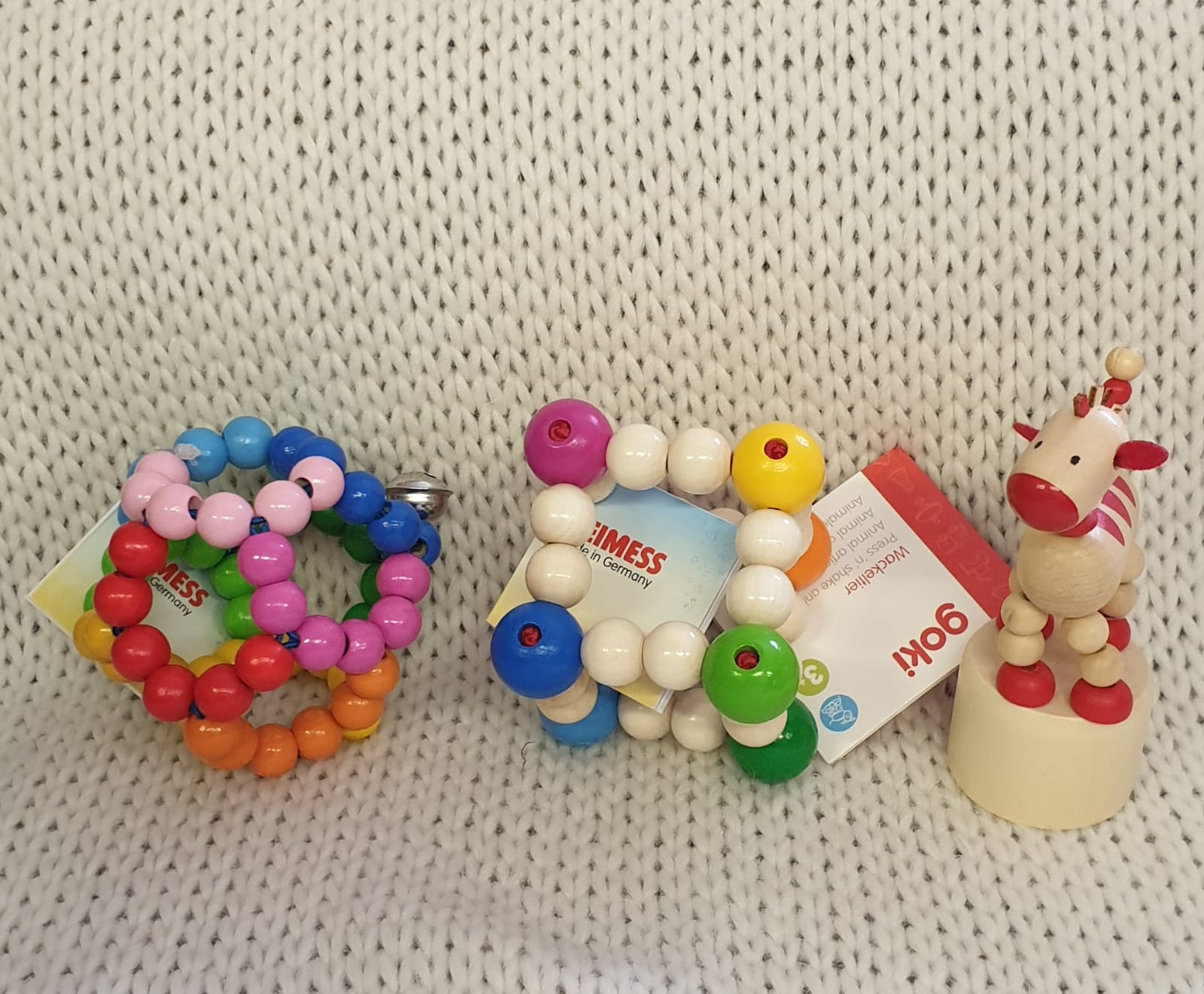 We stock wooden toys - handmade, fair trade from recycled materials including rubber wood. Toys are suitable from 3 months to 14 years. Touch rings, rattles, pram clips, mini trapeze, activity boards, humming tops, hobby horses, push along and pull along toys, dolls, rattles, skipping ropes, puzzles, activity toys